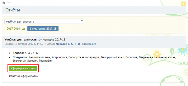 Функция “Отчеты” позволяет формировать отчеты, относящиеся к учебному процессу.